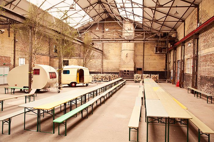 Started by three creative businesses in the area – architects FVMA, design agency Smiling Wolf and Elevator Studios – Camp and Furnace is a café, bar, foodie’s paradise and nightclub, among other things. With its perennial programme of events, the space has a festival feel and is inspired by how outdoor events bring people together. The multi-functional space, decorated with caravans, a wood-burning fire and bare bulbs, also embraces an outdoor aesthetic.