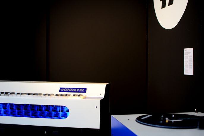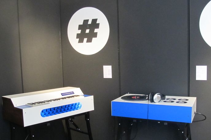 A series of interactive installations enables visitors to explore new ways of experiencing different media. The exhibits are set against a Netstalgic 90s backdrop featuring hash-tag and extra large emoticon symbols printed onto black walls.