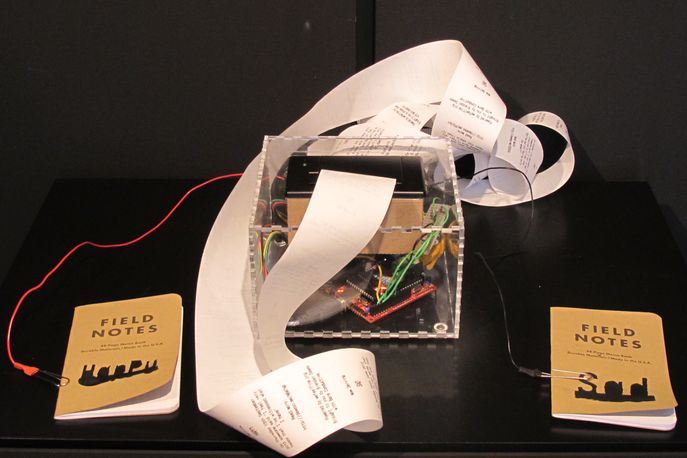 Three installations use conductive ink to connect paper to the internet. The ink transmits a digital code from newspapers or postcards to speakers or headphones, providing a more synaesthetic reading, holding and listening experience.