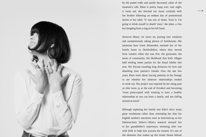 As the reader scrolls through the article copy, black and white photos interchange giving each photo shoot of the singer a GIF-style animation. The story appears on a different site to Pitchfork.com, and bills itself as a cover feature.