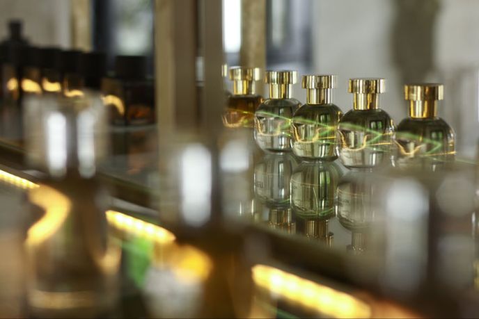 The perfume bar looks like an apothecary. Fragrances in glass bottles line the shelves, and a bar enables customers to sample the vast selection of fragrances, from old favourites to something new.