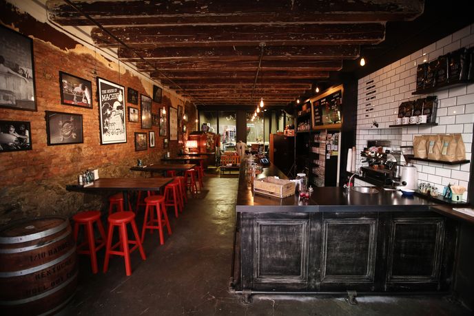The space features a coffee shop that becomes a bar on Thursday and Friday evenings, a clothing section and a glass-walled machine workshop in the back, where motorcyclists can buy retro-styled customised racers, cruisers and more.