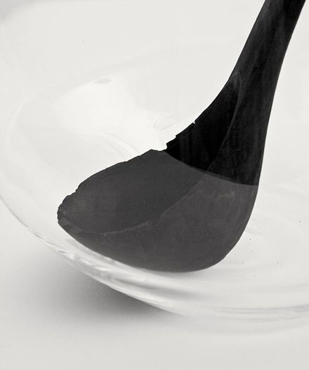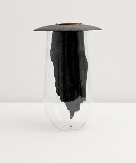 Olive wood and carbonised oak are paired with the blown glass to form the minimalist vessels. Purified water will be served alongside the exhibition next week, highlighting the mineralising process of the charcoal on the water.