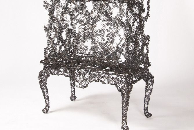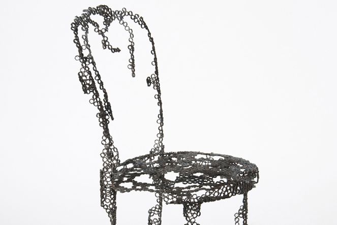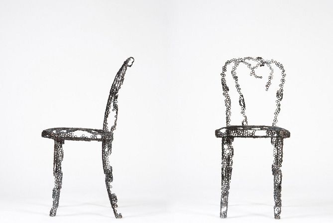 Using rings of tubular steel, Tolvanen covered pieces of furniture before setting them alight. The original furniture was reduced to ash and all that remains are the charred rings. The final piece appears to fade away, conveying the way Alzheimer’s patients slowly lose their memories.