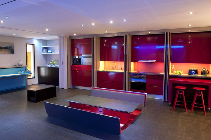The Yo! Home is a flexible living concept that equips an 80-square metre flat with a wide range of functions. The prototype can be configured into a master bedroom suite, a sunken sitting room, a cinema, a dining room, an office, a kitchen and more.