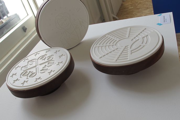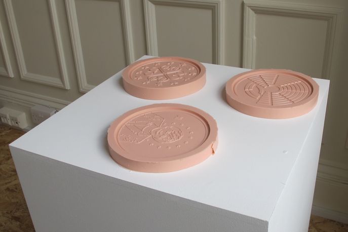 Bread stamps are cast into oversized re-mixed euro coins, portraits of German chancellor Angela Merkel, Ionic columns and miniature amphitheatres in an apparent comment on the effects of the euro crisis on Greek society. Cast in off-white, pale pink or blue silicon with pink casting moulds, the pieces are discreet and tactile objects, which, in the traditional café setting, relate the tension between the current reality of Greek euro-dependency and the nation’s historic position as the birthplace of European culture.