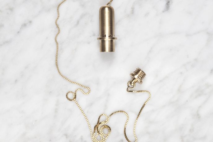 ‘All the tools can be attached to the opening of a perfume bottle,’ says Kocken. ‘The tools absorb the scent and work as fragrance diffusers that can be worn. In places where the skin is most vulnerable, the precious metal is warmed up so that the scent can travel. Any skin contact with the perfumed liquid is thus avoided.’