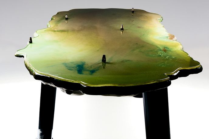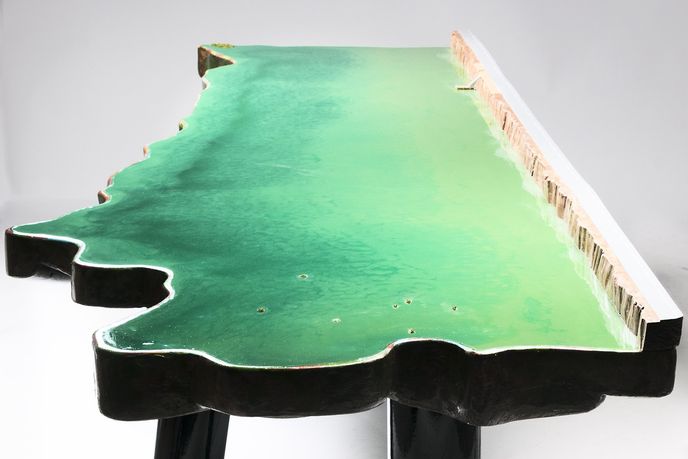 Mimicking a lagoon, an ocean, a pond, a river, a lake and a puddle in supreme clarity, the six tables are made from polyurethane, PVC and resin, contrasting a synthetic structure with a natural subject.