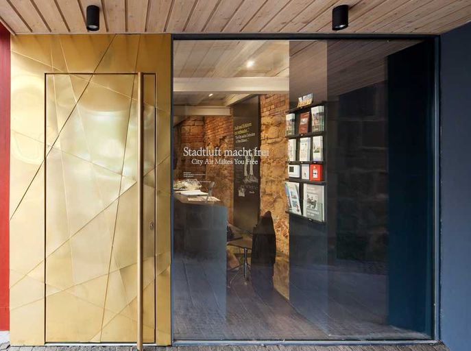 Sitting near a twisting spire at the heart of the town’s medieval core, the new structure has a façade covered in golden copper metal panels. The irregular pattern creates an impression of machine-like precision, but in fact is a work of craftsmanship executed by a tinsmith.