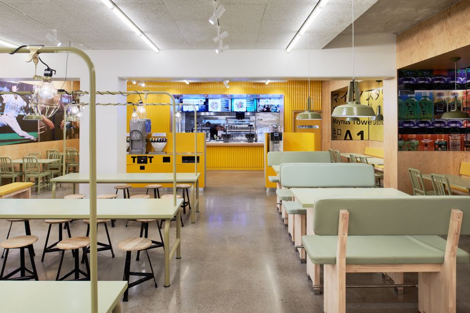 Furniture was custom-designed for the space and inspired by outdoor street stalls. Yoi project manager Yvonne Fung tells LS:N Global that the overall design was informed by photos from the clients’ study trip to Japan, with the goal of achieving ‘a mixture of playfulness, rawness, comfort and functionality’. Strategic designers JVD reproduced some of the photos for bold wall graphics.