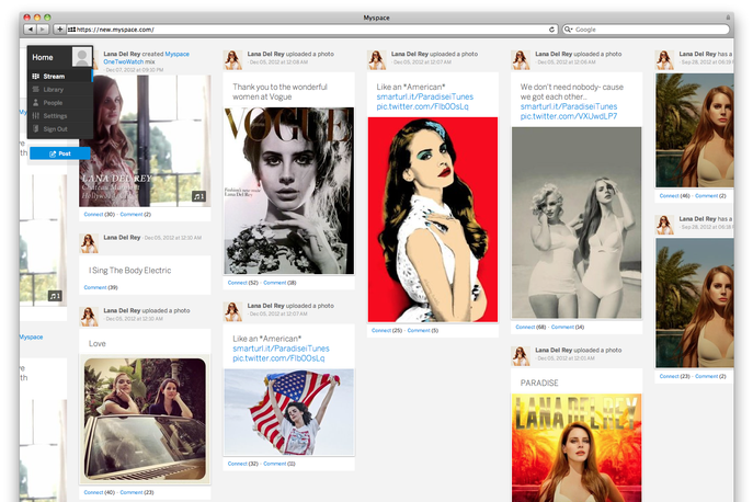 Known in the past for its bewildering customised profile pages, Myspace will now have the design and integrated feel of a tablet magazine. Users can navigate through high-resolution graphics, mix tapes of audio and visual content, and status updates with horizontal scrolling.