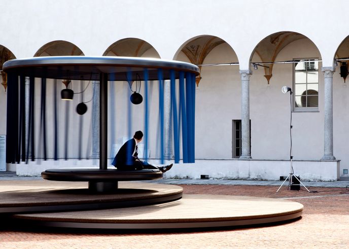 The installation, Quiet Motion, comprises a set of rotating cork platforms in a courtyard. Visitors can sit among hanging strips of fabric, which as they spin, give the installation a carousel look.