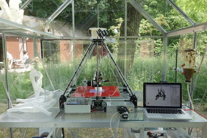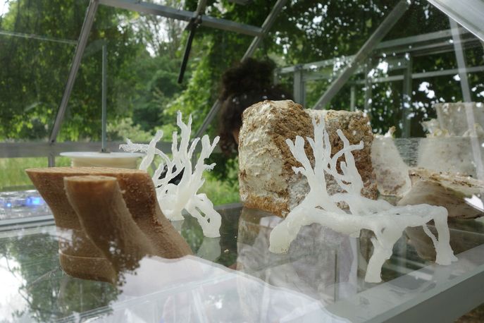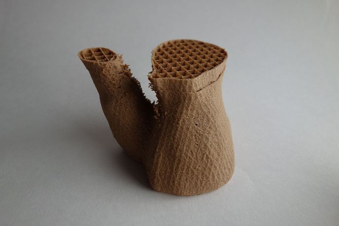 Klarenbeek worked with scientists at the University of Wageningen to create a living material that could be used in a 3D printer. He blended mycelium – the thread-like network inside funghi – with water and straw. Once printed, the mycelium continued to grow, replacing the water to create a lightweight but sturdy structure. Klarenbeek stopped the growing process by drying out the chair and coating it in a fine layer of bioplastic.