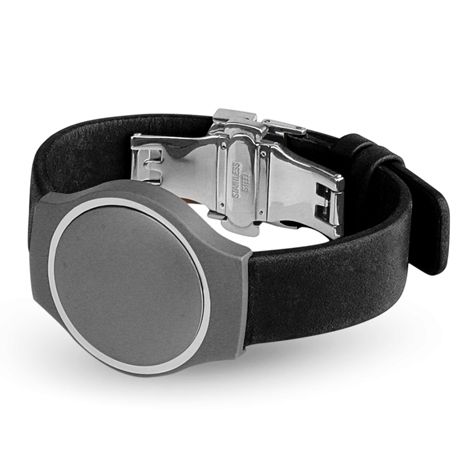 The device is an aluminium disc that can be attached to clothes, worn as a watch or even as a necklace. There is no digital display. Users simply touch the device to their smartphone screen and it will transfer the data to an accompanying app.