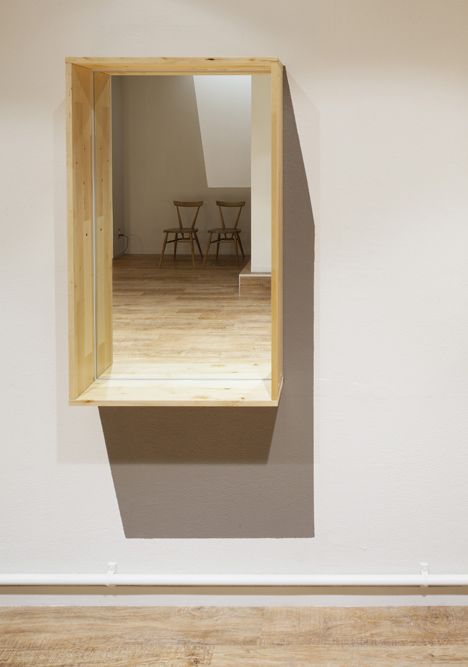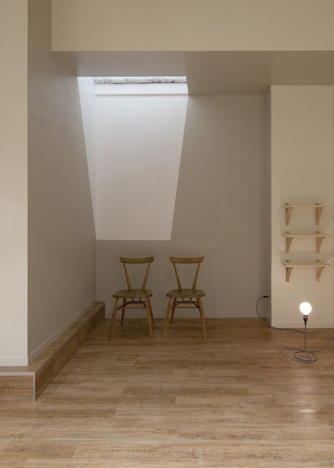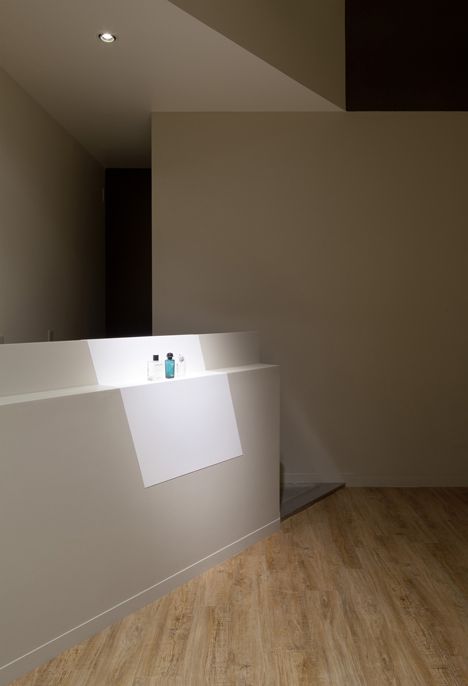 The design studio used warm artificial lighting and a grey and white colour palette to paint fake shadows and create the appearance of shards of sunlight on the walls coming from a non-existent window.