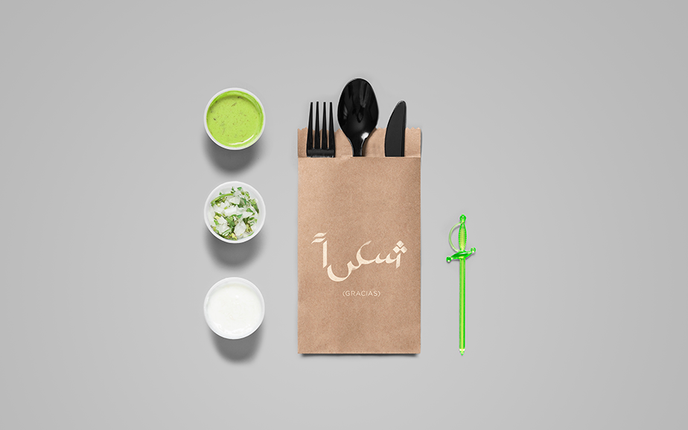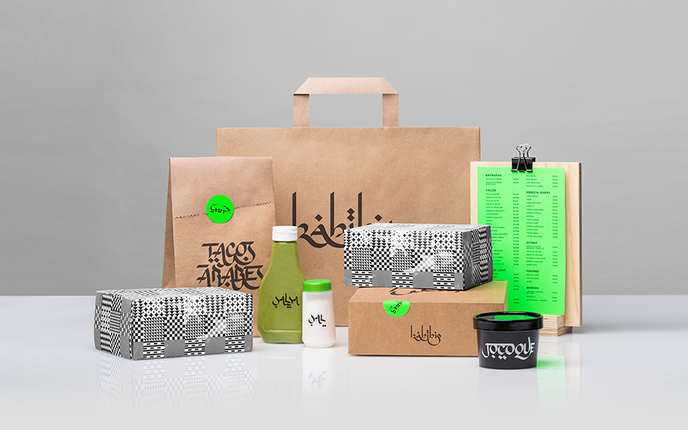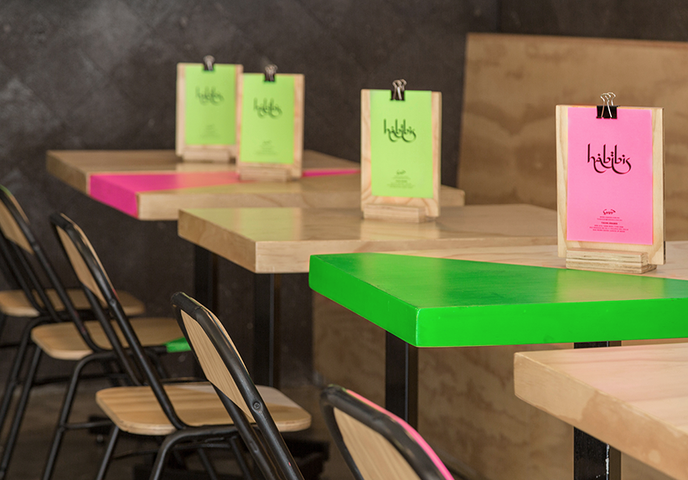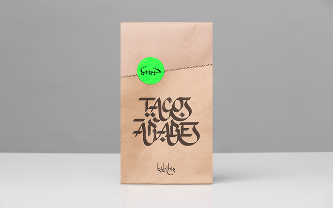 The concept of Habibis is perfectly realised in the branding, designed by Mexican studio Anagrama. The studio used stylised Arabic calligraphy to promote the typically Mexican street fare, with paper packaging and neon colours to highlight the food’s casual nature.