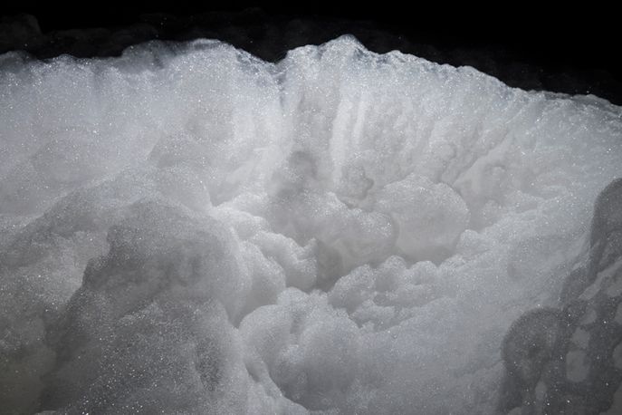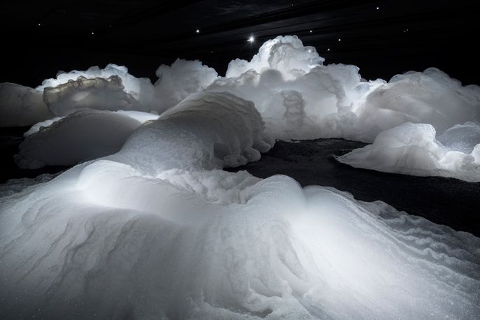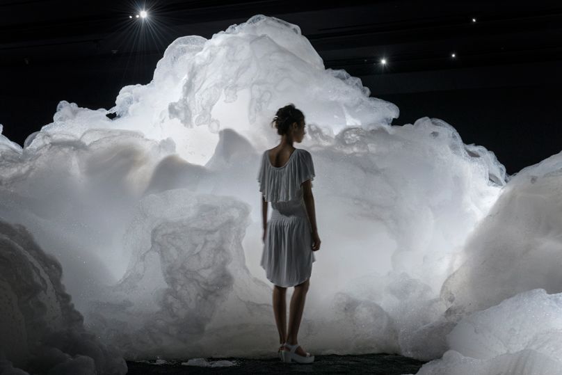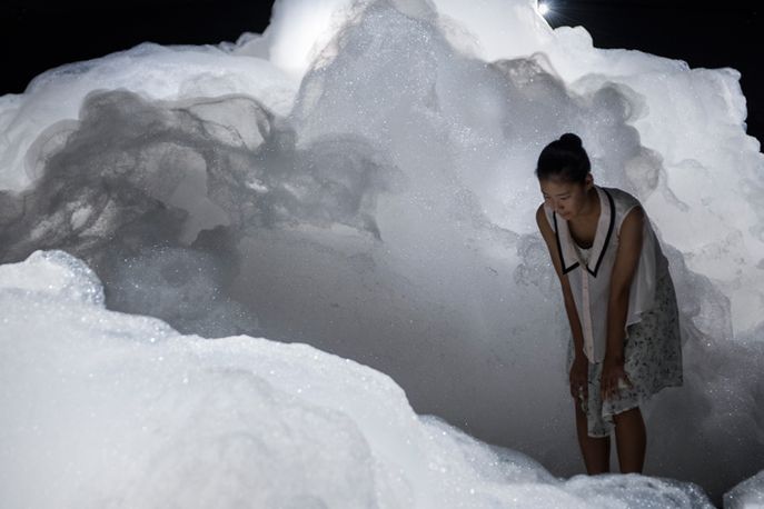The large-scale project, held as part of Nagoya city’s Aichi Triennale, allows guests to wander through a dark room filled with billowing foam peaks made of water, detergent and glycerin.