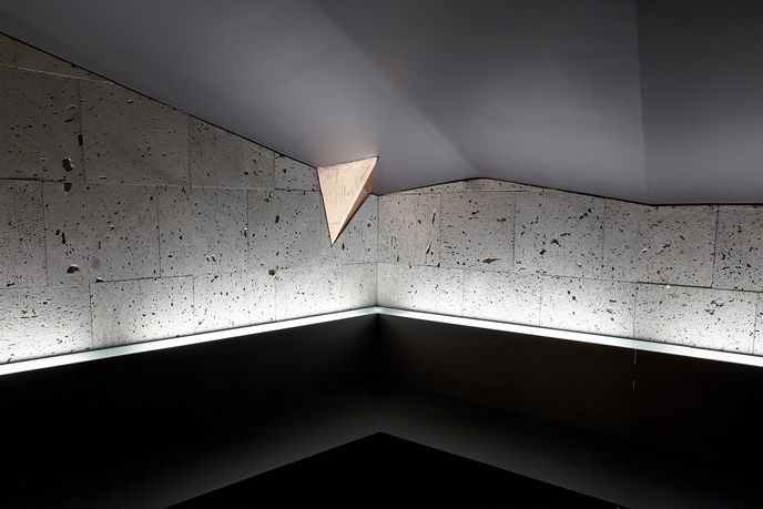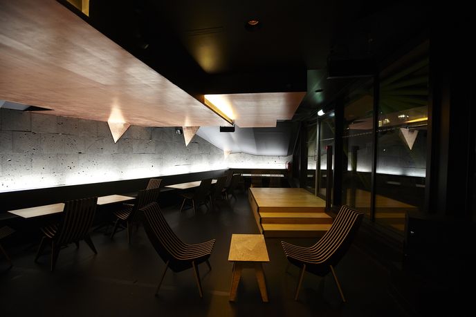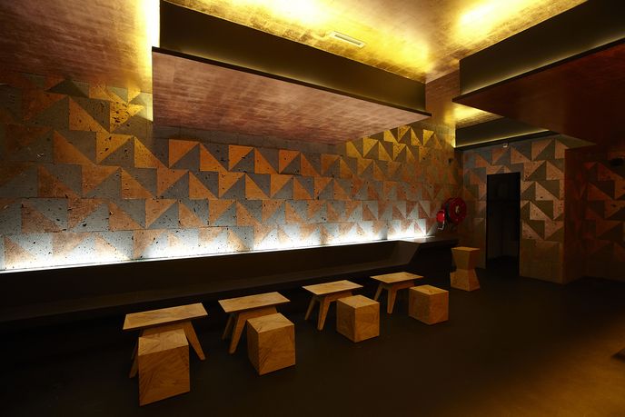 Designed by Emmanuel Picault, Ludwig Godefroy and Nicolas Sisto, the Nüba Club interior features volcanic stone walls covered in a geometric pattern of copper-leaf triangles, giving the space a dark, shadowy aesthetic.